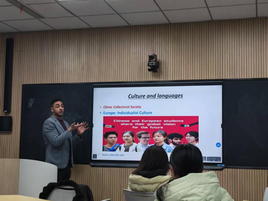 第二場講座邀請到外教Hassan、海外在讀優(yōu)秀畢業(yè)生代表王灝陽、研學歸來的學生代表楊斐然等5人,通過線上線下結合的方式展開分享。楊斐然、張金洲結合墨爾本研學經(jīng)歷,從藝術氛圍、教育特色、交通條件等維度,生動展現(xiàn)海外生活圖景,激發(fā)同學們對國際化成長的向往。王灝陽、劉晨曦、陳卓等通過視頻連線,分別從校園環(huán)境、學術生態(tài)、課程設置等維度,對比分析中外大學教育模式的差異,幫助同學們直觀理解海外求學的核心特點與挑戰(zhàn)。王灝陽在分享中強調(diào),留學不僅是學術深造,更是傳播中國文化、增強文化自信的過程。外教Hassan從跨文化適應視角出發(fā),解析留學中的文化沖突與應對策略,建議通過觀看英文影視作品提升語言能力,并鼓勵同學們在跨文化交流中保持自信表達。