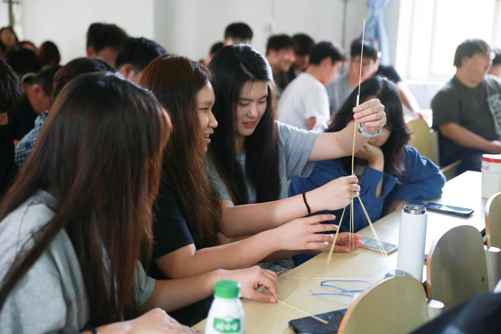 教授將“棉花糖挑戰(zhàn)”搬進課堂,組織現(xiàn)場同學(xué)利用意大利面、膠帶和棉花糖進行搭建。從最初的設(shè)計構(gòu)思到實際搭建,再到反復(fù)拆解重構(gòu),棉花糖挑戰(zhàn)見證了思維碰撞與迭代優(yōu)化的全過程。此起彼伏的討論與成功搭建后的歡呼,充分彰顯出濃厚的學(xué)術(shù)實踐氛圍與團隊凝聚力。隨后,Robin Bell教授借助TED演講再次強調(diào)了原型迭代對于新產(chǎn)品設(shè)計的重要性。