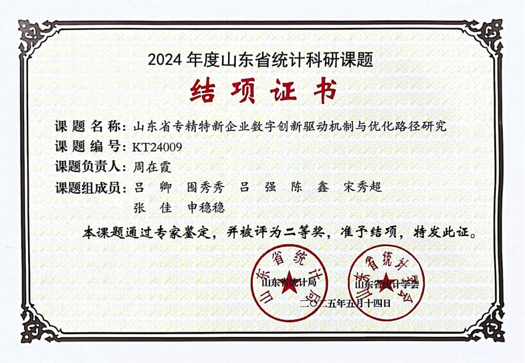 周在霞老師主持的《山東省專精特新企業(yè)數(shù)字創(chuàng)新驅(qū)動(dòng)機(jī)制與優(yōu)化路徑研究》(課題編號(hào)KT24009),獲評(píng)二等獎(jiǎng);黃瑤老師主持的《山東提升制造業(yè)數(shù)字化轉(zhuǎn)型效能的影響因素及實(shí)現(xiàn)路徑》(課題編號(hào)KT24030),獲評(píng)三等獎(jiǎng)。
